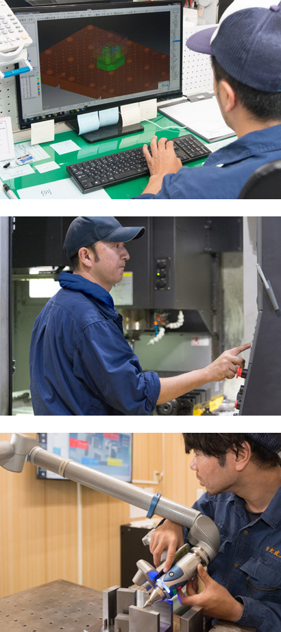 多年に渡る豊富な経験と知識・技術を活かし、新時代・新技術に呼応した新たなる飛躍に挑戦しています。3DCAD、CAMによる金型や機械部品の加工、治具の設計、組立、プレス、レーザー測定まで一貫管理が可能。短納期、高品質な製品を作り上げていきます。